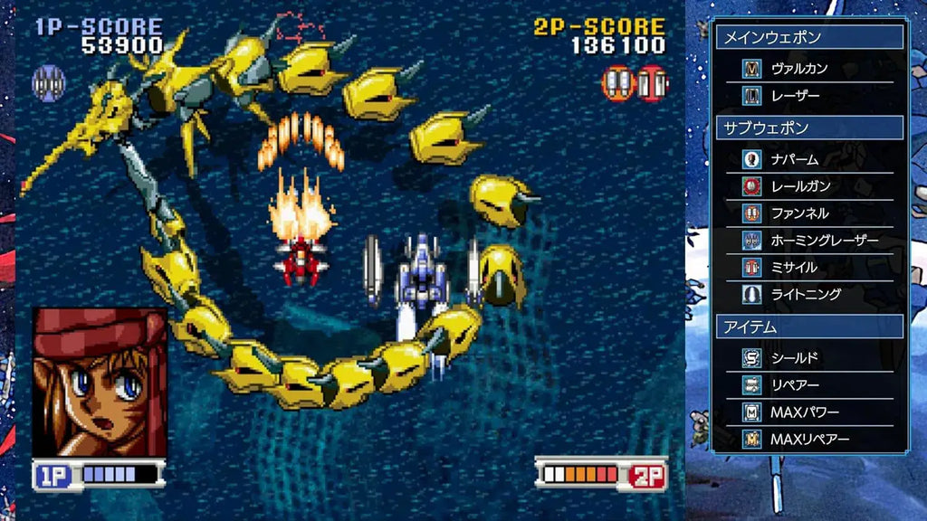Players can obtain and power up two types of main shots and six types of sub-weapons. Utilize special techniques such as the "Weapon Crash", which temporarily boosts sub-weapons, and the "Boost" ability, which lets you momentarily accelerate to dodge enemy attacks.